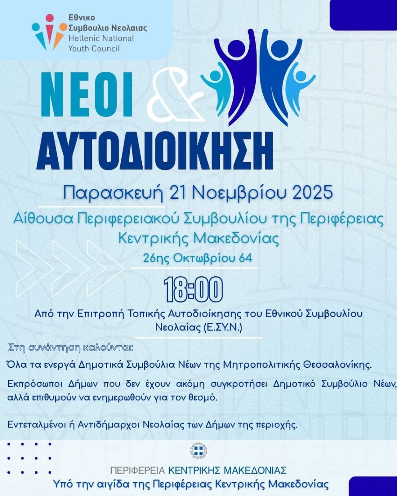 Το Εθνικό Συμβούλιο Νεολαίας και η Επιτροπή Τοπικής Αυτοδιοίκησης στο πλαίσιο της θεσμικής ενίσχυσης και δικτύωσης των Δημοτικών Συμβουλίων Νέων καθώς και της προώθησης του ενεργού ρόλου των νέων στην τοπική αυτοδιοίκηση, σας προσκαλούν μαζί με την Περιφέρεια Κεντρικής Μακεδονίας, στην διαδημοτική θεσμική συνάντηση συνεργασίας που θα πραγματοποιηθεί την: